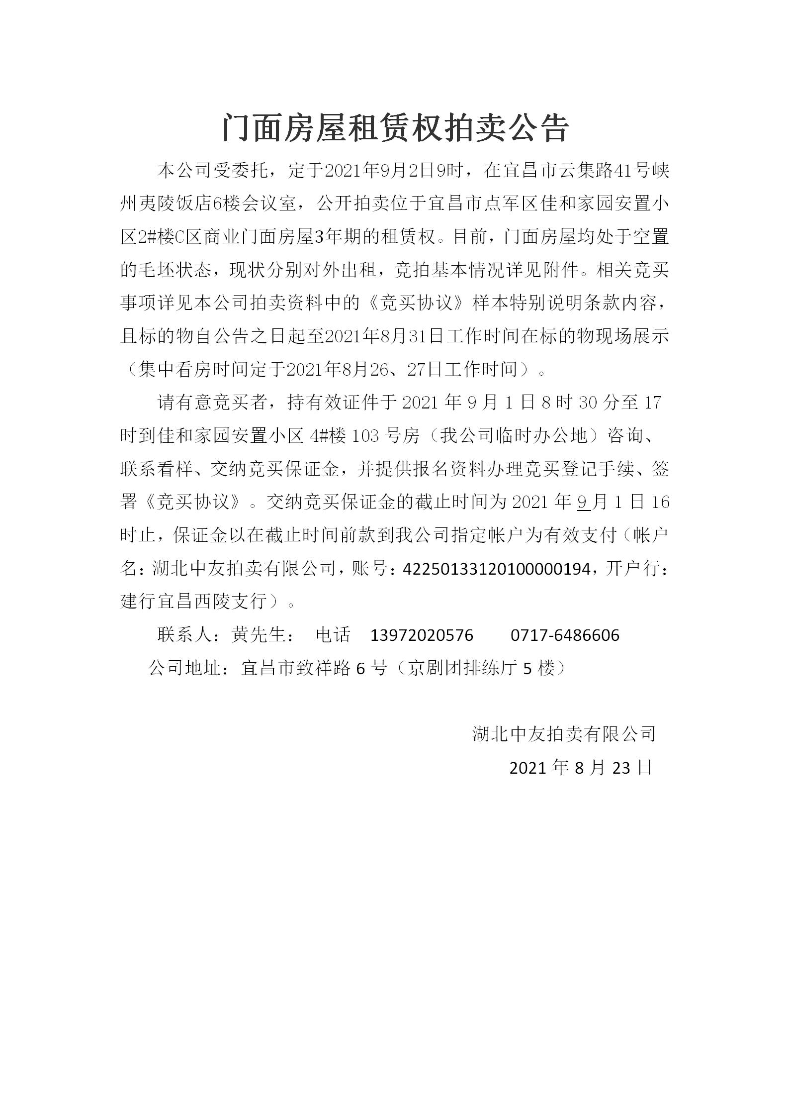 (通訊員周琴、彭曉燕)點(diǎn)軍區(qū)佳和家園安置小區(qū)2#樓C區(qū)商業(yè)門面房屋是點(diǎn)軍區(qū)國(guó)資局授權(quán)宜昌點(diǎn)盛投資開發(fā)有限公司經(jīng)營(yíng)管理的安置房商業(yè)資產(chǎn),目前該項(xiàng)目正在開展租賃權(quán)競(jìng)拍工作,競(jìng)拍公告已發(fā)布點(diǎn)軍區(qū)人民政府網(wǎng),現(xiàn)將公告內(nèi)容公布如下: