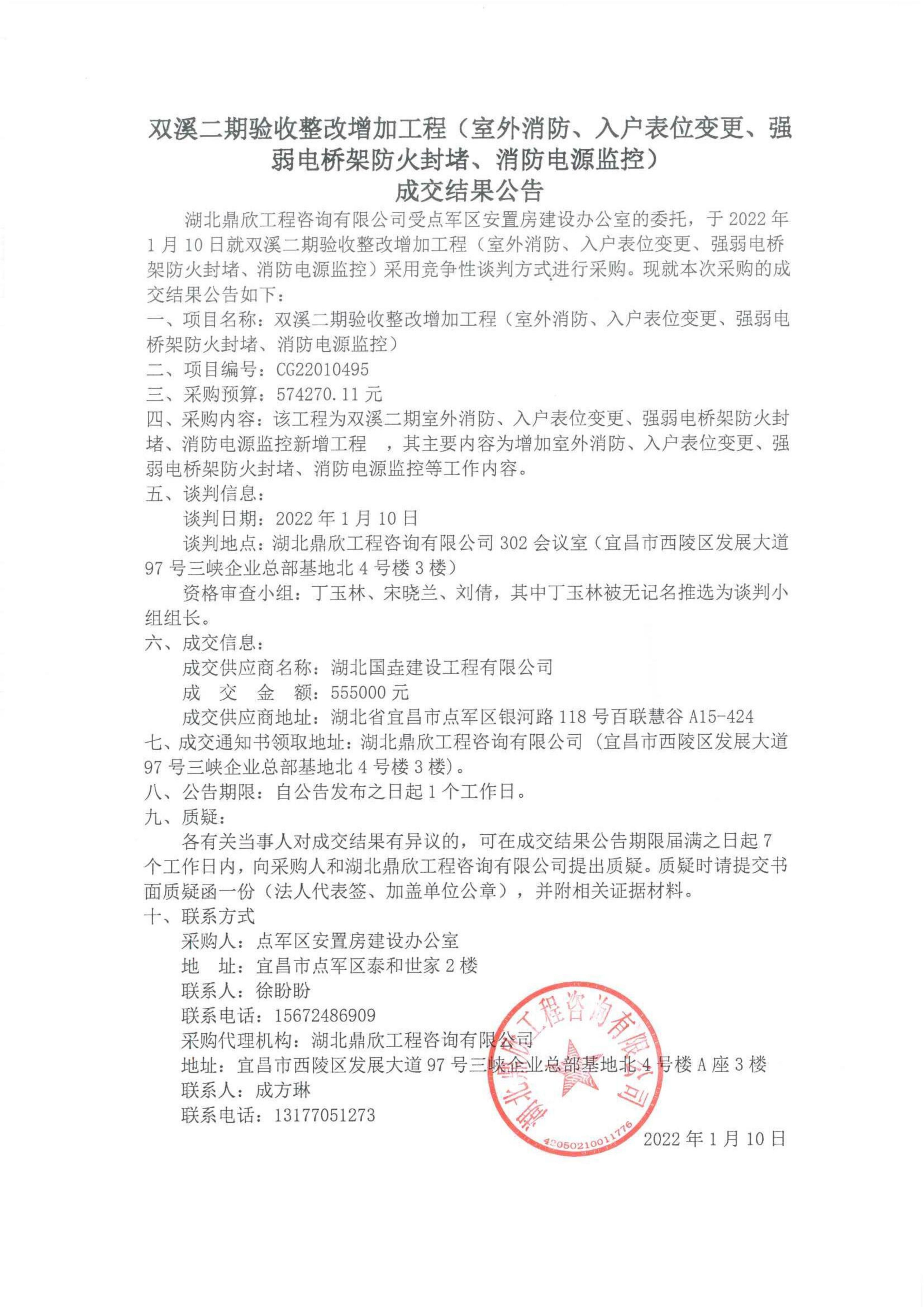 雙溪二期驗收整改增加工程(室外消防、入戶表位變更、強(qiáng)弱電橋架防火封堵、消防電源監(jiān)控)?成交結(jié)果公告