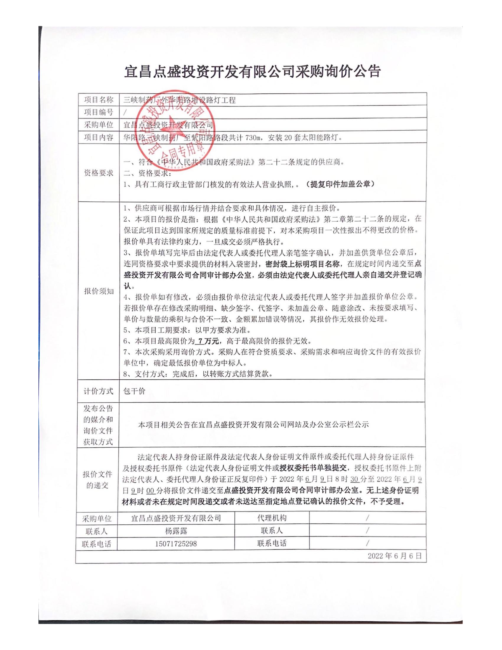 詢價公告-三峽制藥廠外華陽路增設(shè)路燈工程