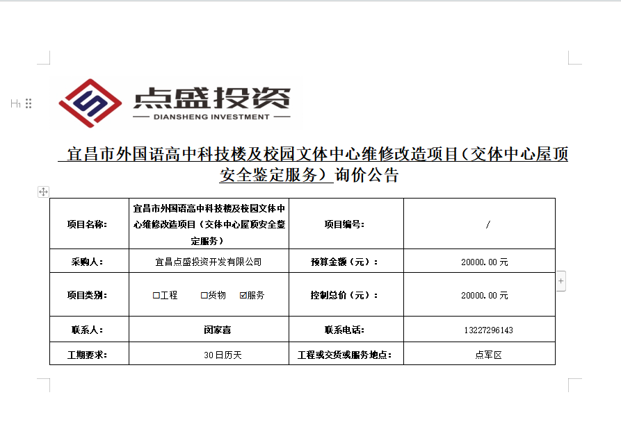 宜昌市外國(guó)語(yǔ)高中科技樓及校園文體中心維修改造項(xiàng)目(交體中心屋頂安全鑒定服務(wù))詢(xún)價(jià)公告