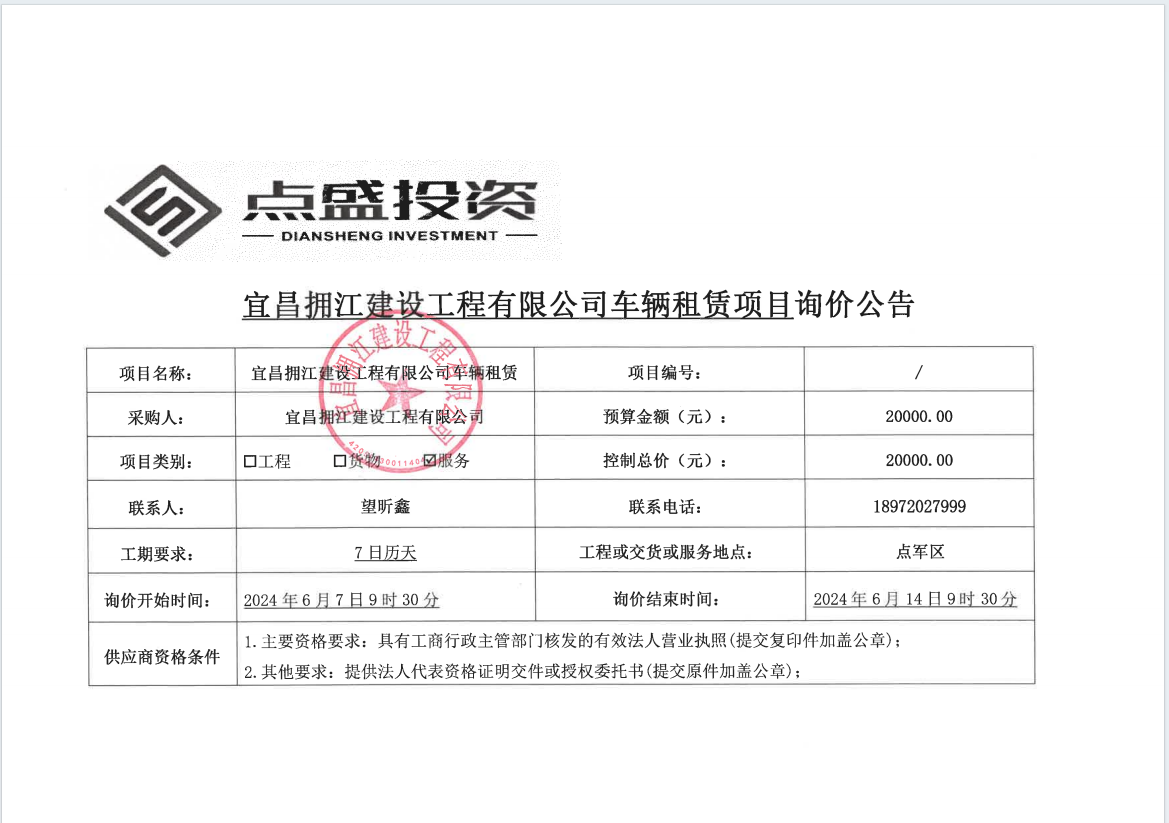 宜昌擁江建設(shè)工程有限公司車輛租賃項(xiàng)目詢價公告