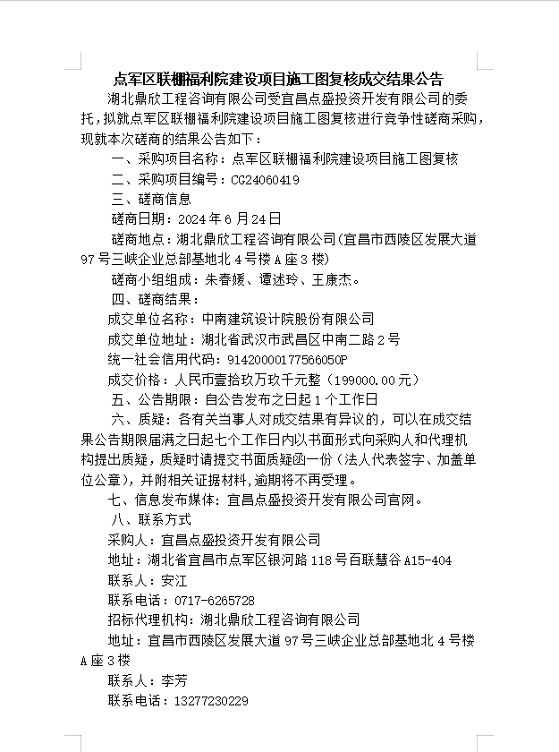 點軍區(qū)聯(lián)棚福利院建設(shè)項目施工圖復(fù)核成交結(jié)果公告