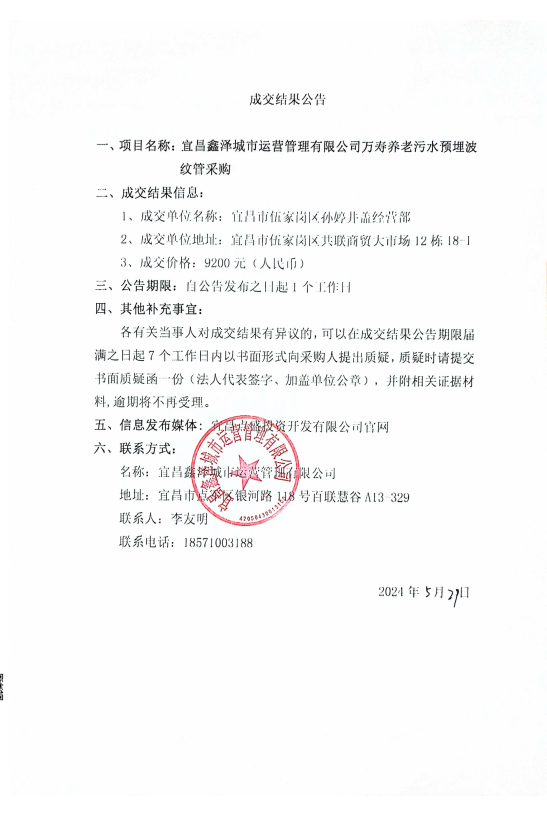 萬壽養(yǎng)老污水預埋波紋管采購成交公告