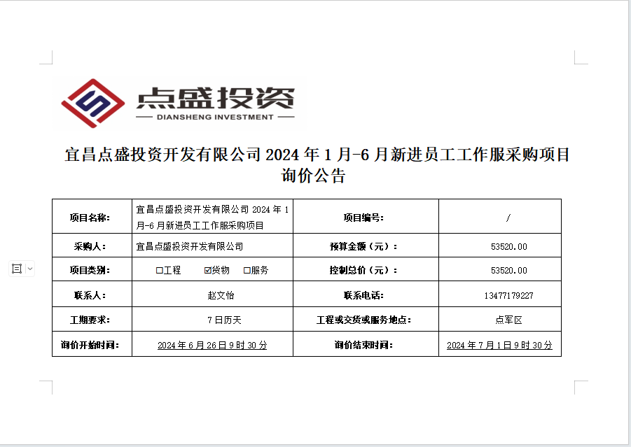 宜昌點盛投資開發(fā)有限公司2024年1月-6月新進員工工作服采購項目詢價公告