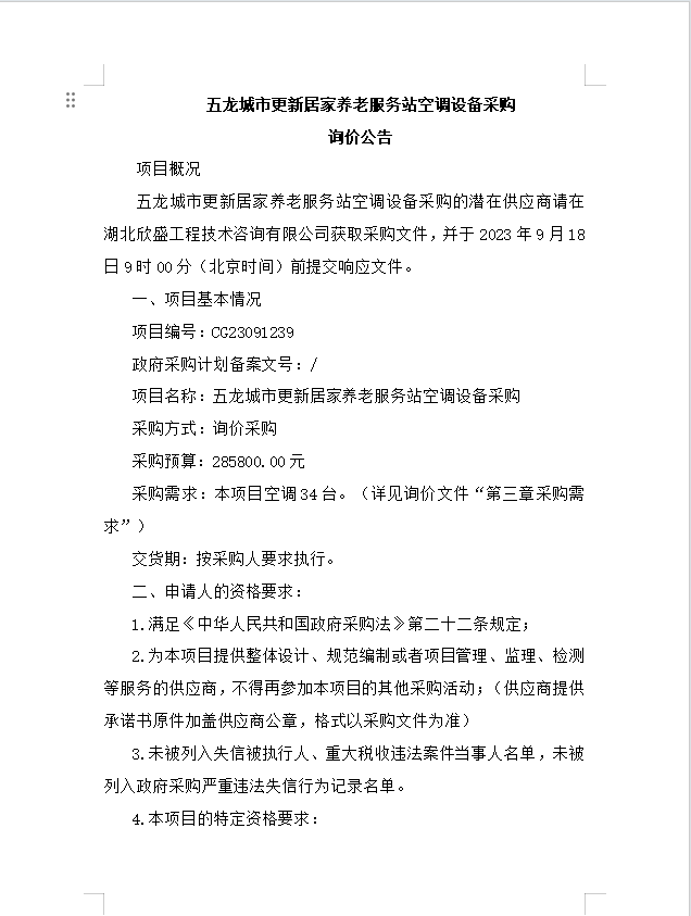 五龍城市更新居家養(yǎng)老服務(wù)站空調(diào)設(shè)備采購詢價公告