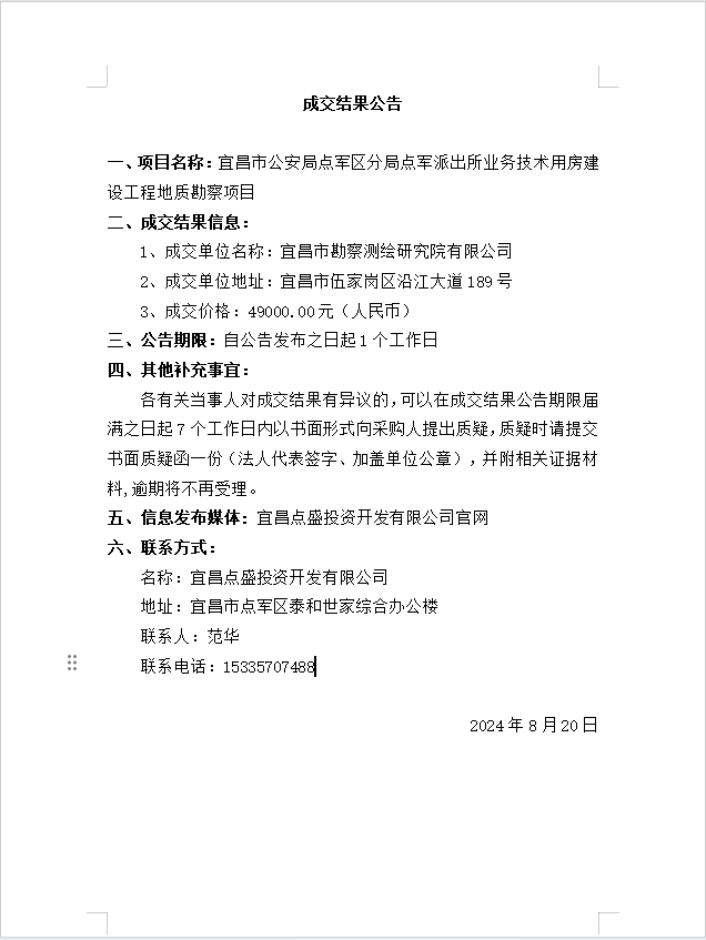宜昌市公安局點軍區(qū)分局點軍派出所業(yè)務(wù)技術(shù)用房建設(shè)工程地質(zhì)勘察項目成交公告