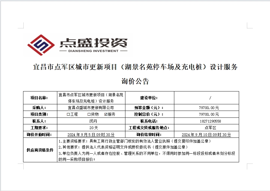 宜昌市點(diǎn)軍區(qū)城市更新項(xiàng)目(湖景名苑停車(chē)場(chǎng)及充電樁)設(shè)計(jì)服務(wù)詢(xún)價(jià)公告