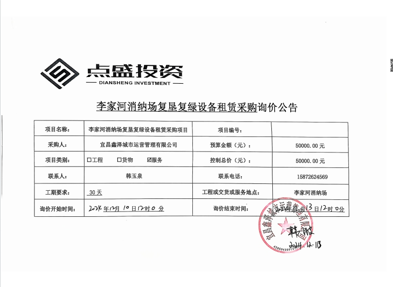 李家河銷鈉場復墾復綠設備租賃采購項目詢價公告