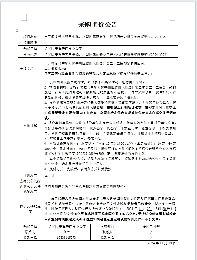 點軍區(qū)安置房零星維修、小型附屬配套類工程招標代理服務年度采購(2024-2025)詢價公告