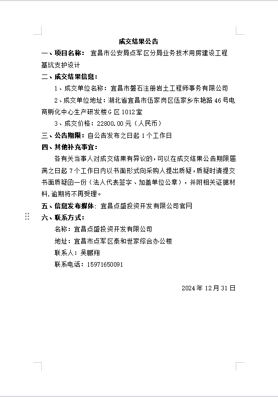 宜昌市公安局點軍區(qū)分局業(yè)務技術用房建設工程基坑支護設計成交公告
