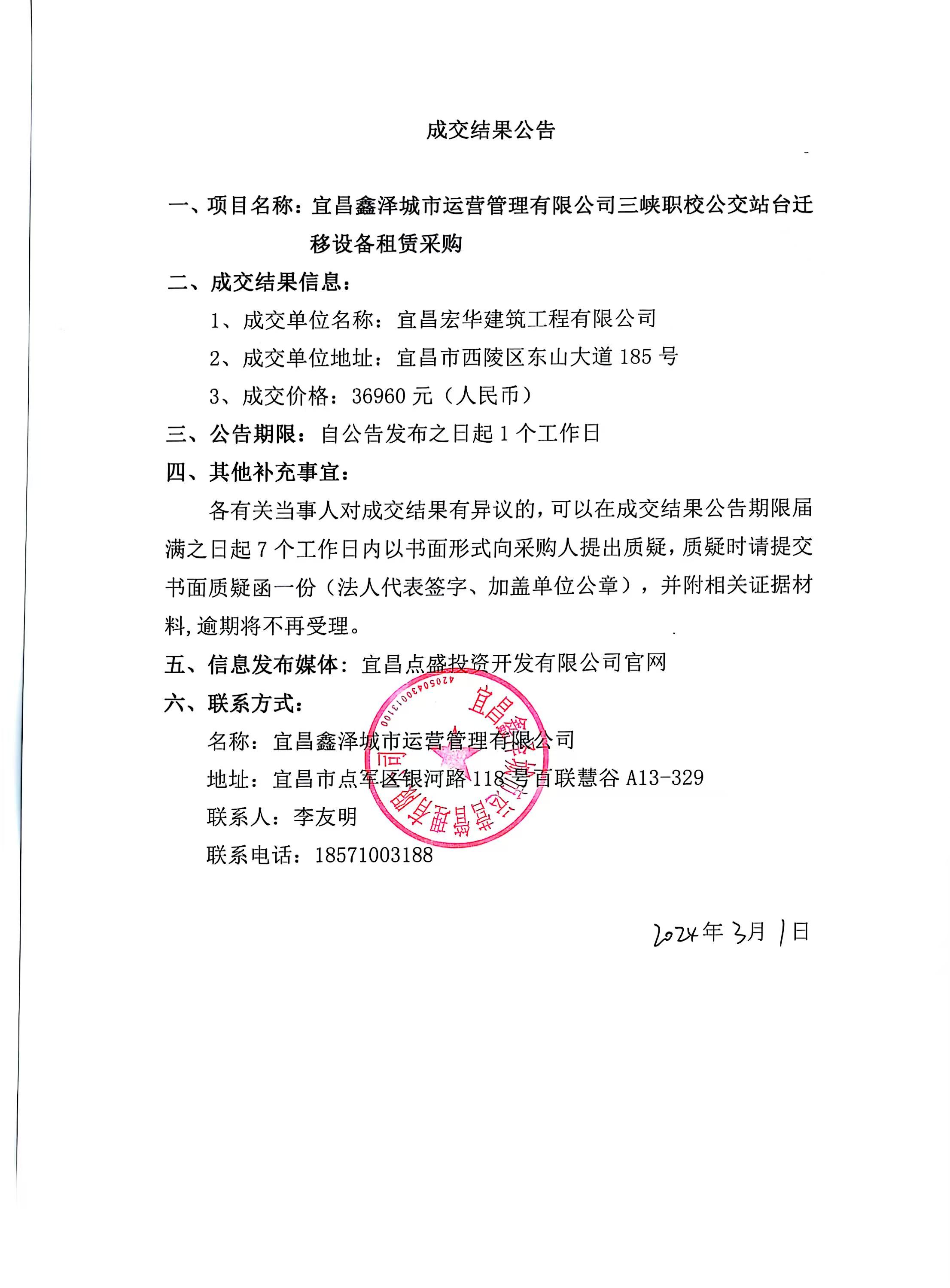 三峽職校公交站臺遷移項(xiàng)目設(shè)備租賃采購成交公告